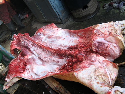 Тънкостта тук е всичко да се почисти и оправи, така че да не се замърси коремната кухина тъй като там ще се забърка сместа за кървавицата и от ще се нагнете ( натъпка) в дебелото черво. А то ( червото) не се реже и маха. Почиства се, обръща се и се прекарава през отвора на Дто на прасето.